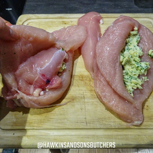 Take your chicken breasts and remove the mini fillets, set aside. Cut half way down the breast to create a pocket - be careful not to cut all the way through. This is where your butter will go. Pat out the mini breast slightly with a gentle 'bash' of a rolling pin.